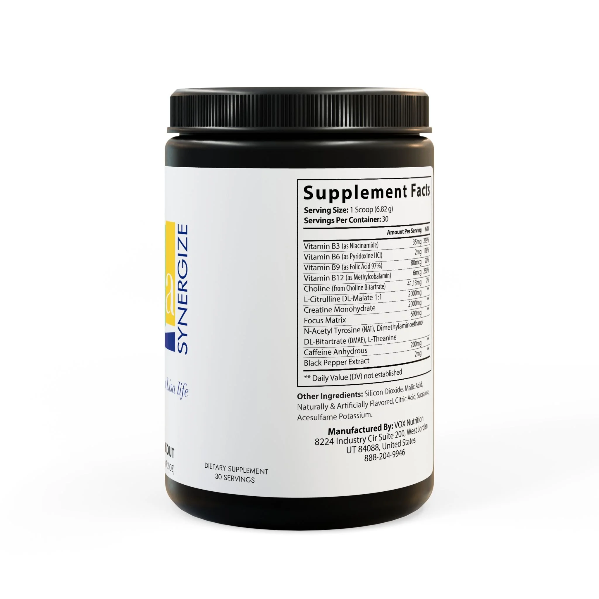Ingredients: Vitamin B3 (as Niacinamide), Vitamin B6 (as Pyridoxine HCl), Vitamin B9 (as Folic Acid 97%), Vitamin B12 (as Methylcobalamin), Choline (from Choline Bitartrate), L-Citrulline DL-Malate 1:1, Creatine Monohydrate, N-Acetyl Tyrosine (NAT), Dimethylaminoethanol, DL-Bitartrate (DMAE), L-Theanine, Caeine Anhydrous, Black Pepper Extract. Other Ingredients: Silicon Dioxide, Malic Acid, Naturally & Articially Flavored, Citric Acid, Sucralose, Acesulfame Potassium.